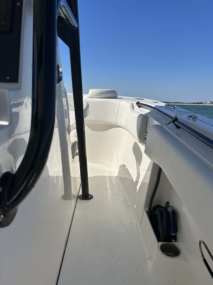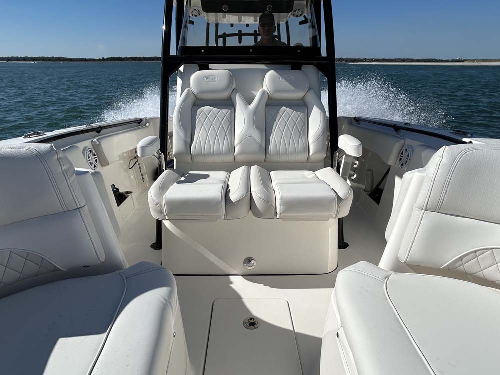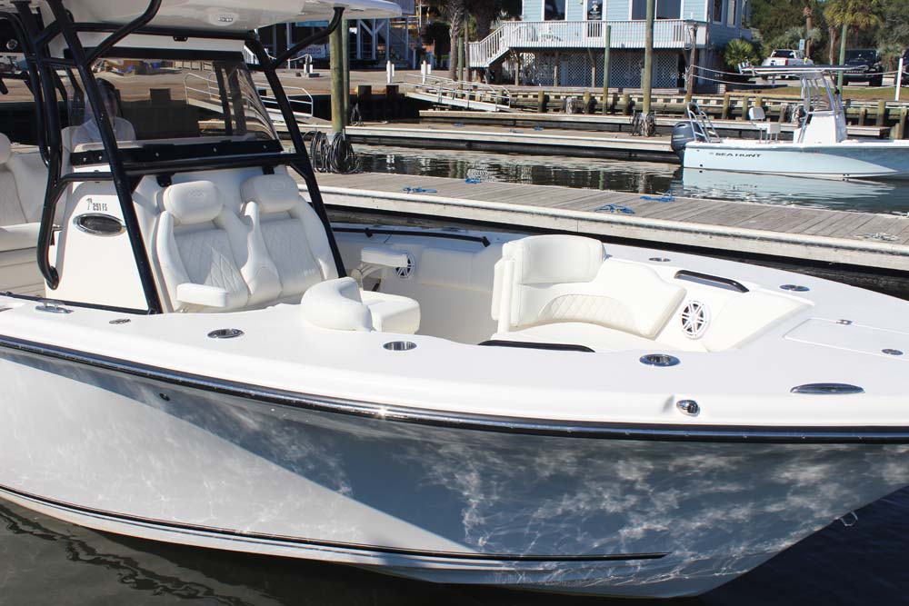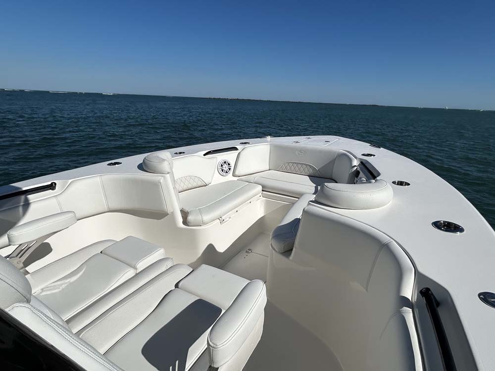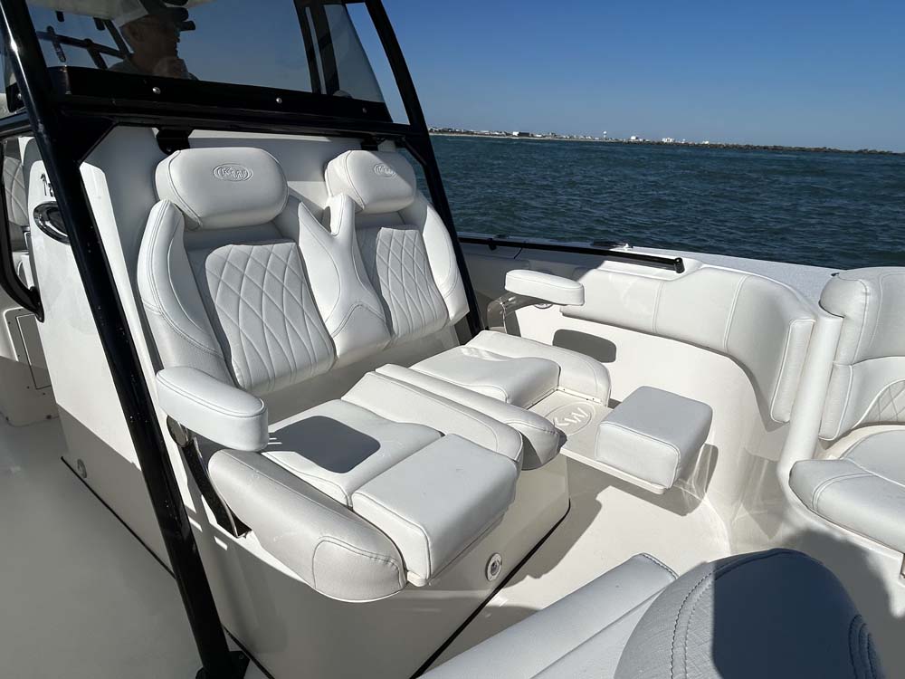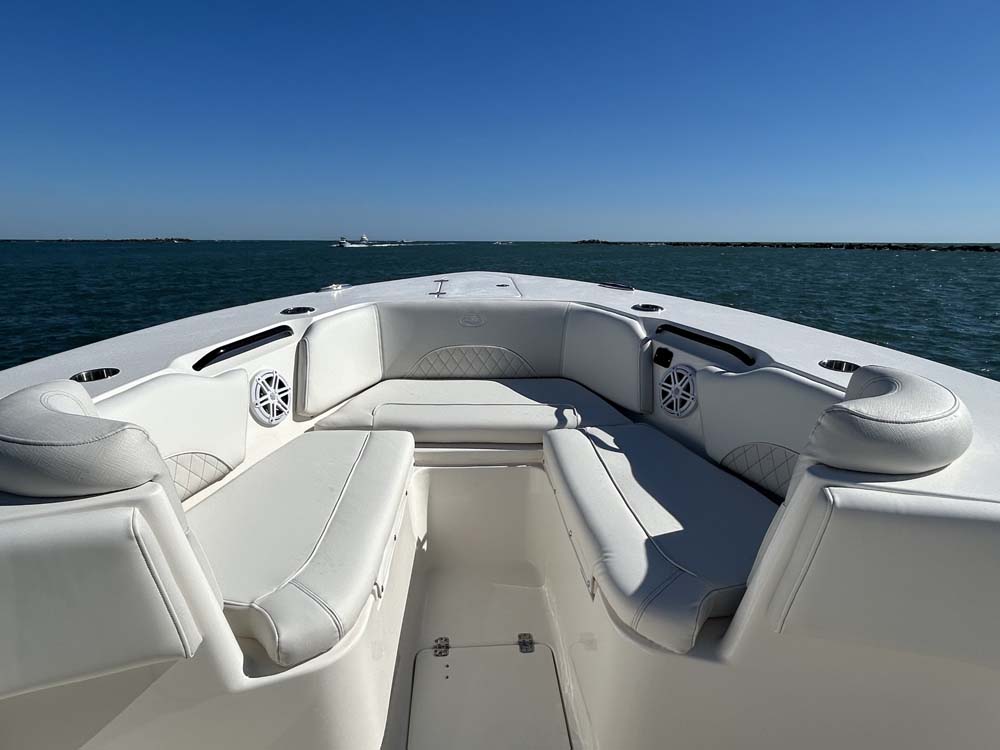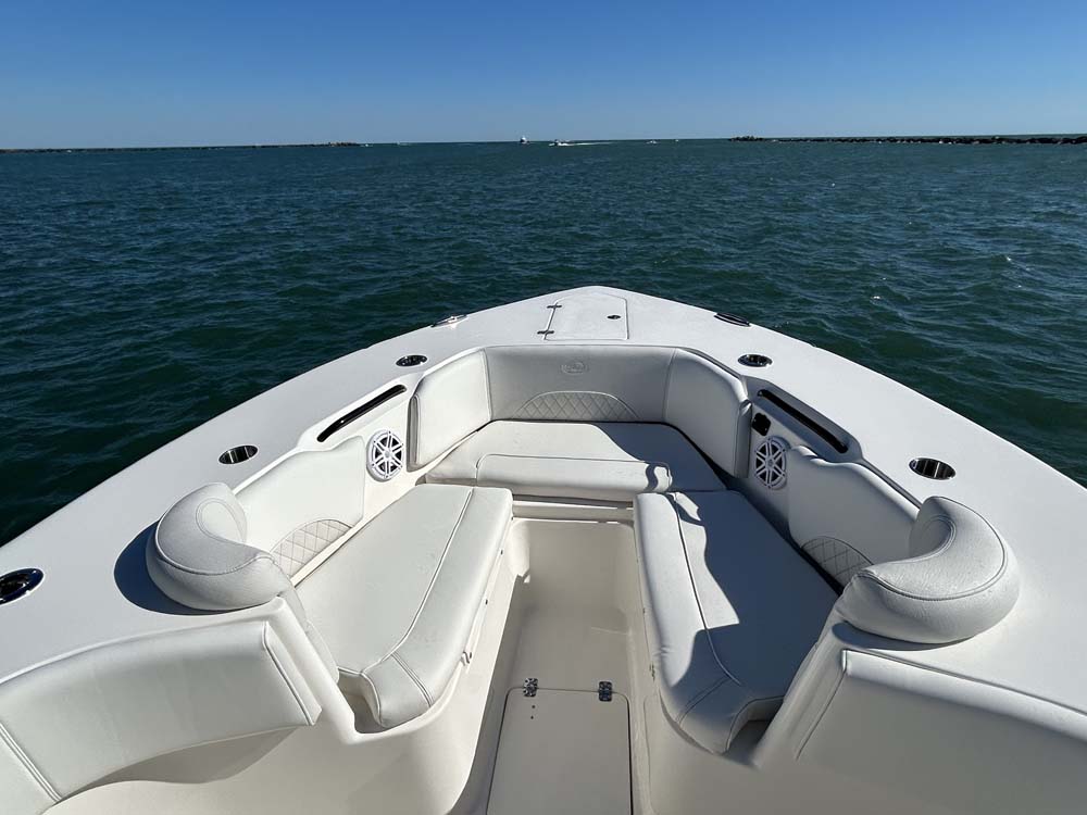 The vessel comes standard with an underdeck windlass, fuel fills on both sides, and side entry doors on each side; one with a hidden ladder and one with a beach anchor. For creature comforts, it is outfitted with wraparound bow seating, slide-out lounge seats on the console front, a lined console interior with a freshwater sink, and a huge dash space for a custom instrument layout. For fishing, it offers dual live wells, large molded-in rod storage racks, plenty of rod holders, an under-deck macerated fish box, and even a Seakeeper option.