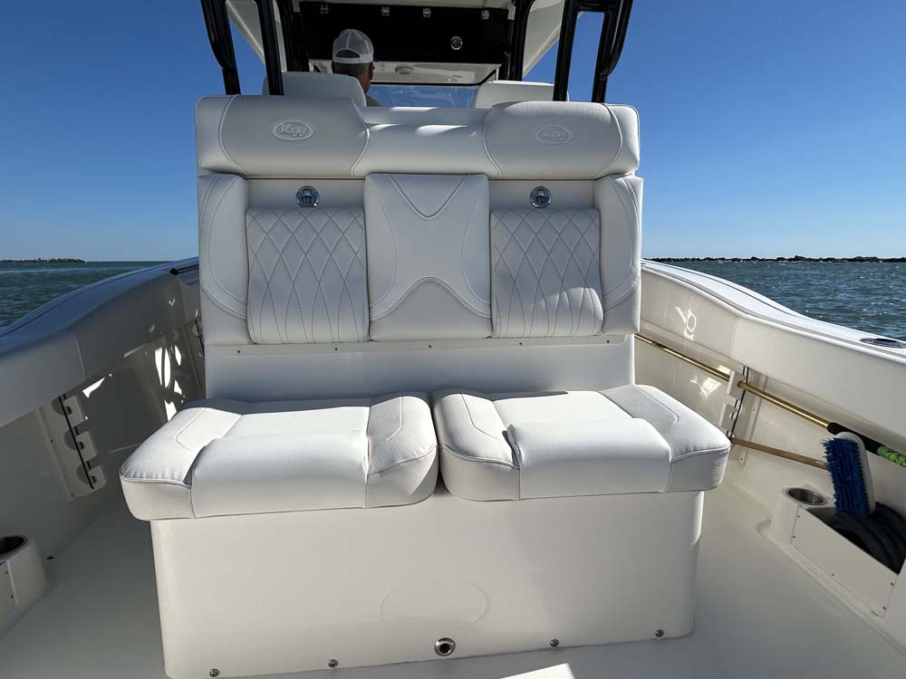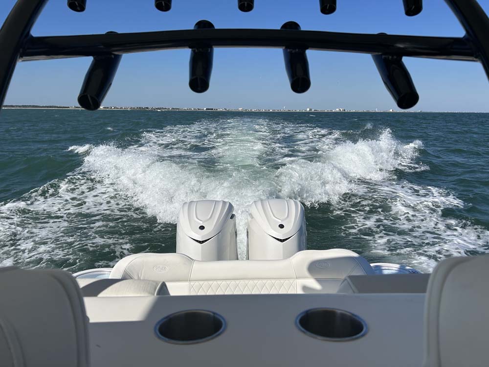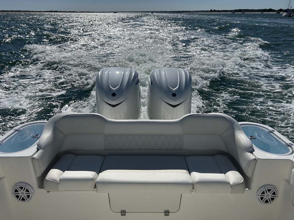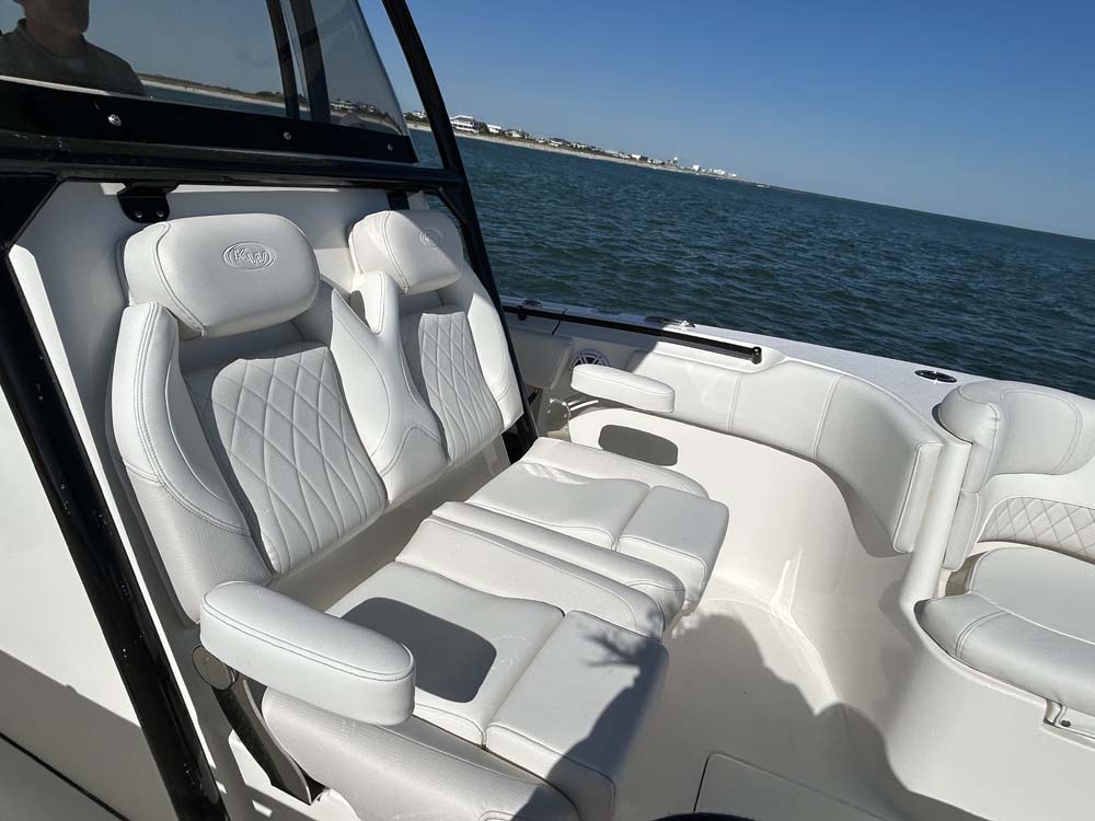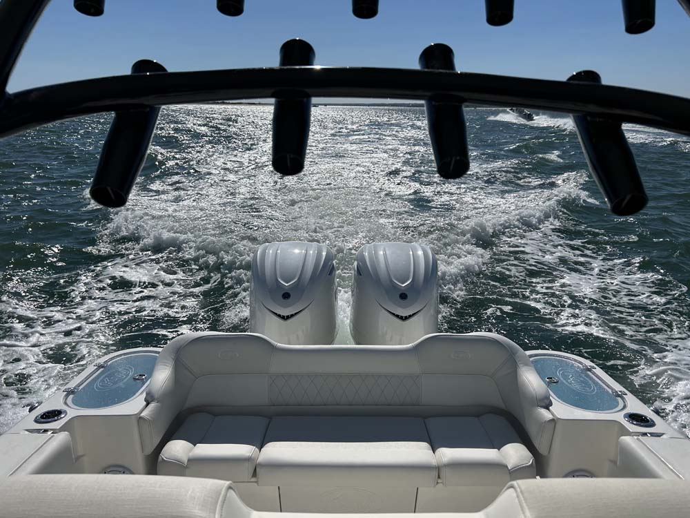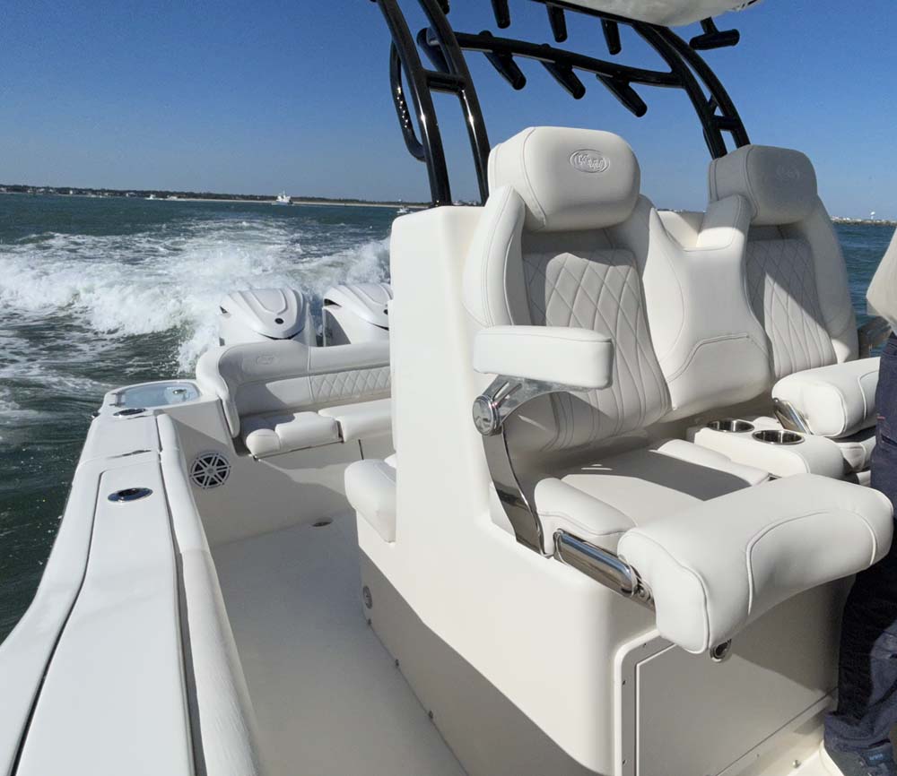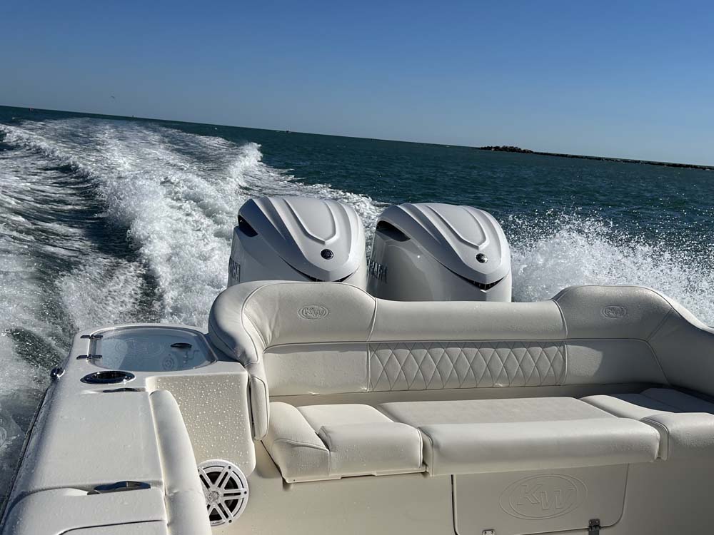 The vessel comes standard with an underdeck windlass, fuel fills on both sides, and side entry doors on each side; one with a hidden ladder and one with a beach anchor. For creature comforts, it is outfitted with wraparound bow seating, slide-out lounge seats on the console front, a lined console interior with a freshwater sink, and a huge dash space for a custom instrument layout. For fishing, it offers dual live wells, large molded-in rod storage racks, plenty of rod holders, an under-deck macerated fish box, and even a Seakeeper option.