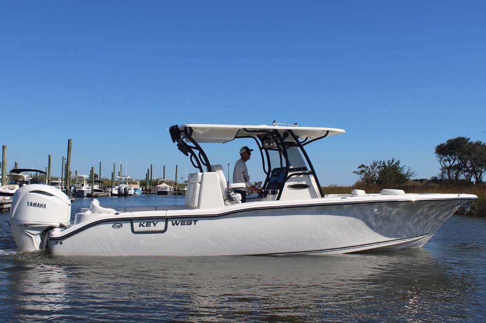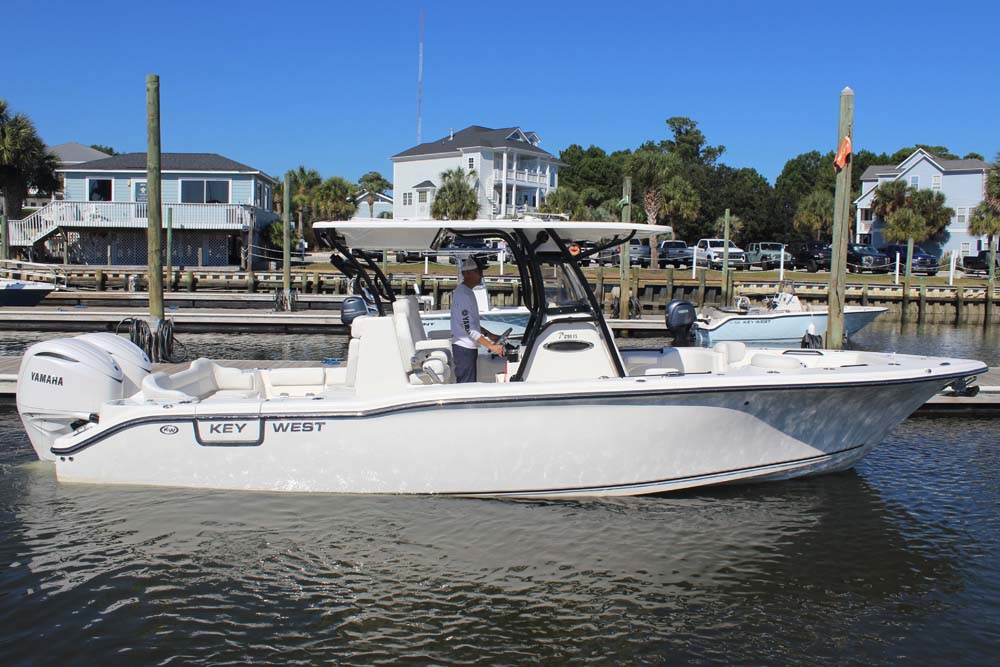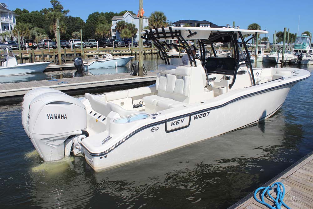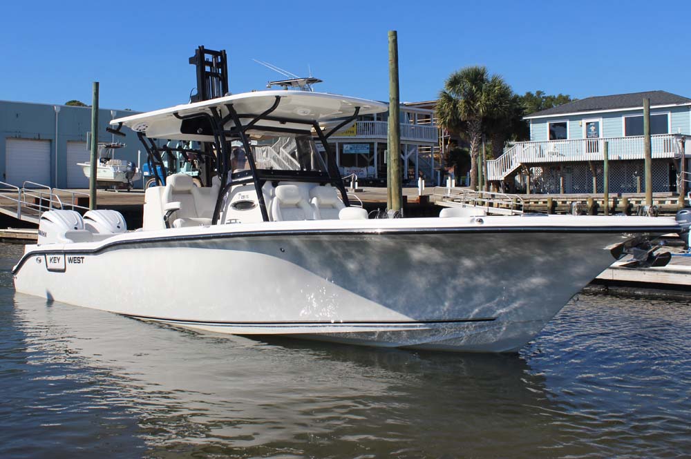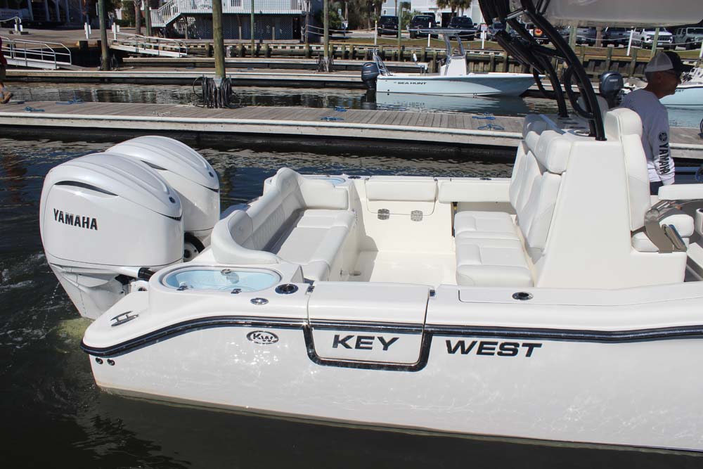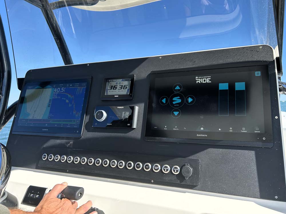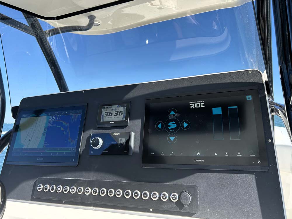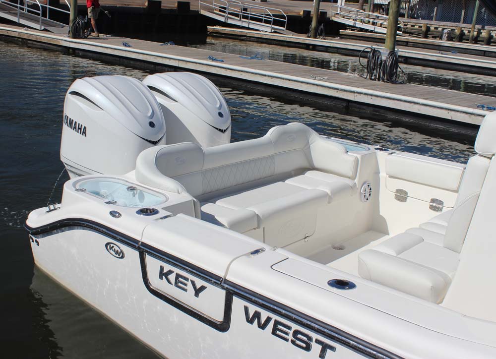 The vessel comes standard with an underdeck windlass, fuel fills on both sides, and side entry doors on each side; one with a hidden ladder and one with a beach anchor. For creature comforts, it is outfitted with wraparound bow seating, slide-out lounge seats on the console front, a lined console interior with a freshwater sink, and a huge dash space for a custom instrument layout. For fishing, it offers dual live wells, large molded-in rod storage racks, plenty of rod holders, an under-deck macerated fish box, and even a Seakeeper option.